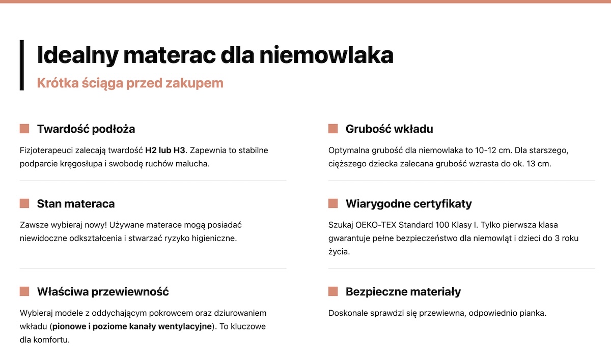 Warto podejść do tego tematu spokojnie i merytorycznie. Dobry materac dla niemowlaka to taki, który jest odpowiednio twardy, przewiewny i wykonany z bezpiecznych, certyfikowanych materiałów. To właśnie te trzy kryteria – a nie cena, moda na kokos czy ładny pokrowiec – powinny decydować o wyborze.
